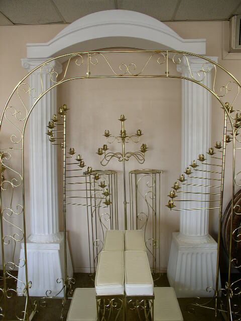 White plastic?Corinthian?style arch. Inside dimensions are 51″W 102″H (in background)