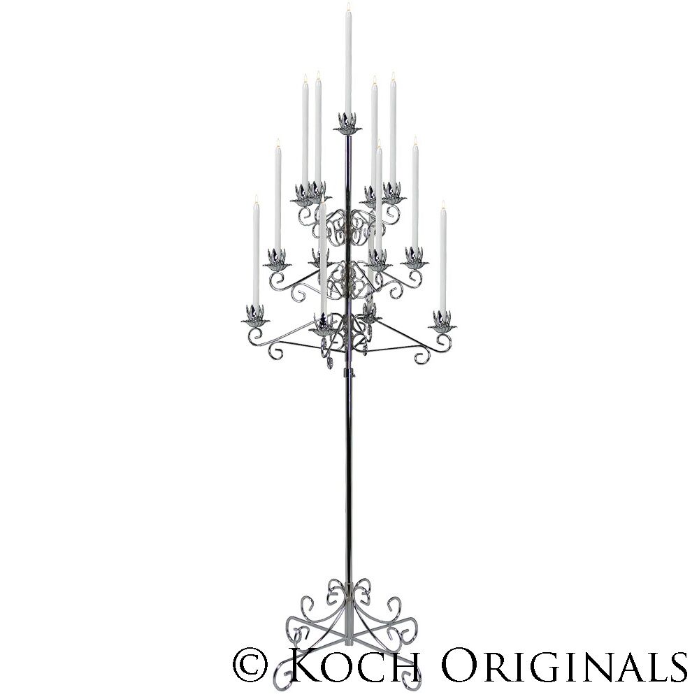 13 branch Silver or Wrought Iron tree candelabra. Includes use of 13 mechanical candles. Adjustable height.
