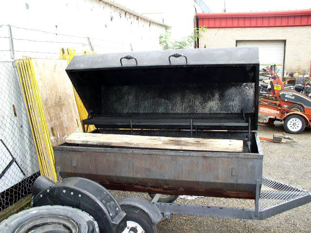 Towable charcoal grill with lid and a 6′ x 3′ main cooking area and an available ~14″ x 6′ upper rack. Also has a prep board that hangs on the front and runs the full width of the grill.