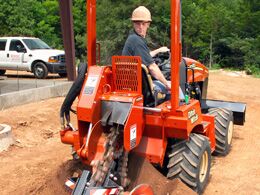 Dig Trenches up to 4 feet deep and 6″ wide , ride on-tractor style, w/backfill blade